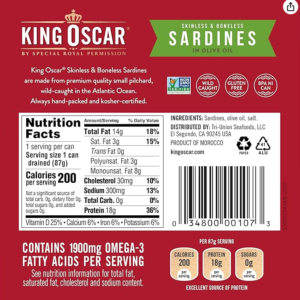 • Sabor rico y delicioso: calidad gourmet, pequeñas sardinas, capturadas en la naturaleza, fileteadas a mano para eliminar la piel y los huesos, y envasadas a mano en aceite de oliva para el mejor sabor más fresco. Es por eso que King Oscar es la sardina número 1 en ventas en Estados Unidos.